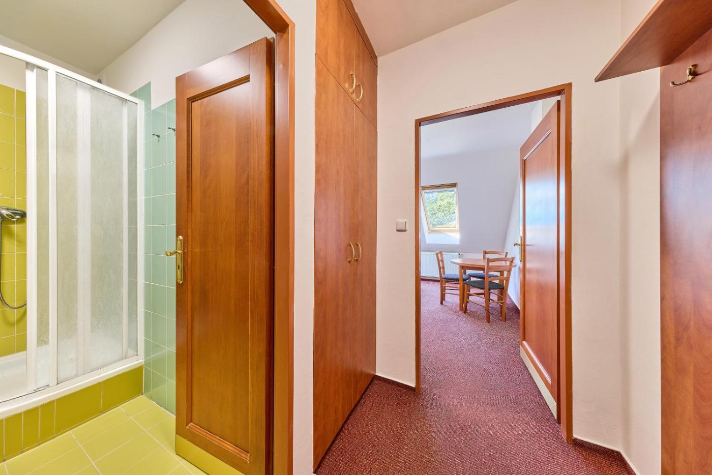 Apartmá se 2 ložnicemi. Featuring a private entrance, this suite consists of 1 living room, 2 separate bedrooms and 1 bathroom with a bath and a hairdryer. Guests can make meals in the kitchen that is equipped with a stovetop, a refrigerator, kitchenware and an oven. The suite features carpeted floors, a seating area with a flat-screen TV, a washing machine, a tea and coffee maker as well as garden views. The unit offers 3 beds. ;